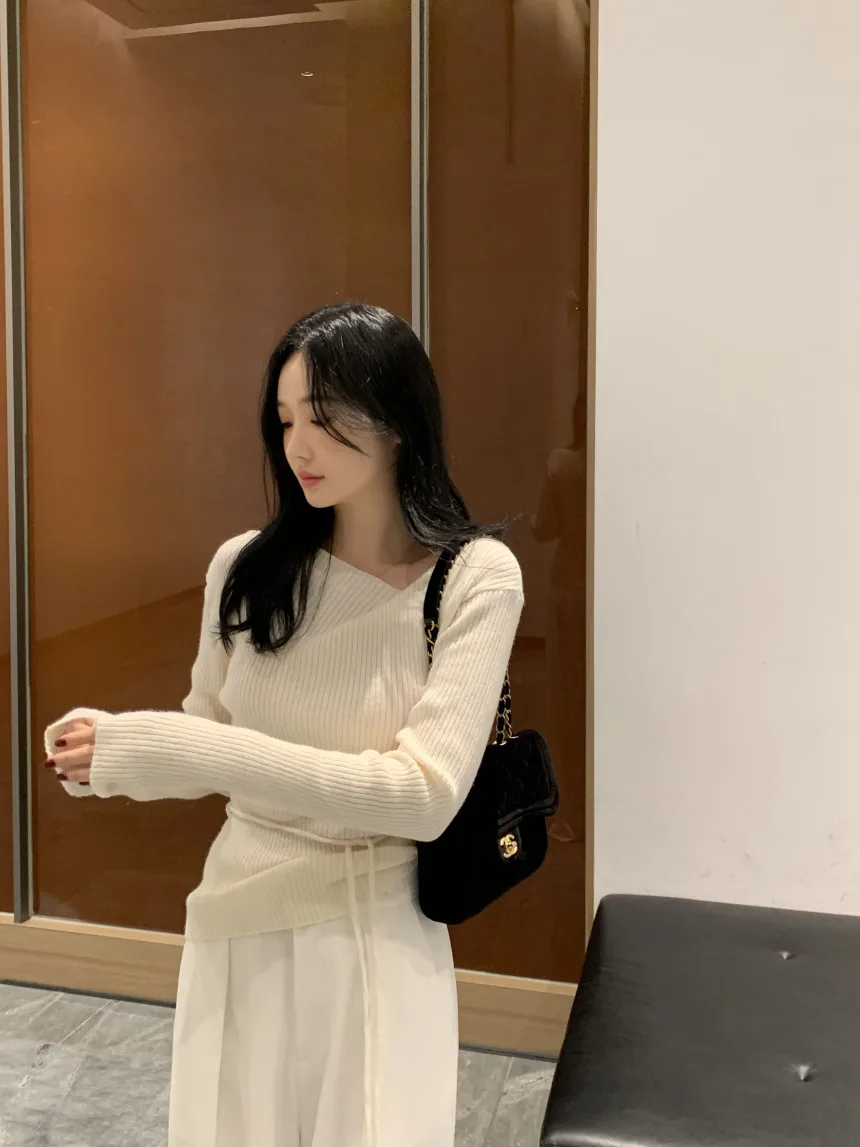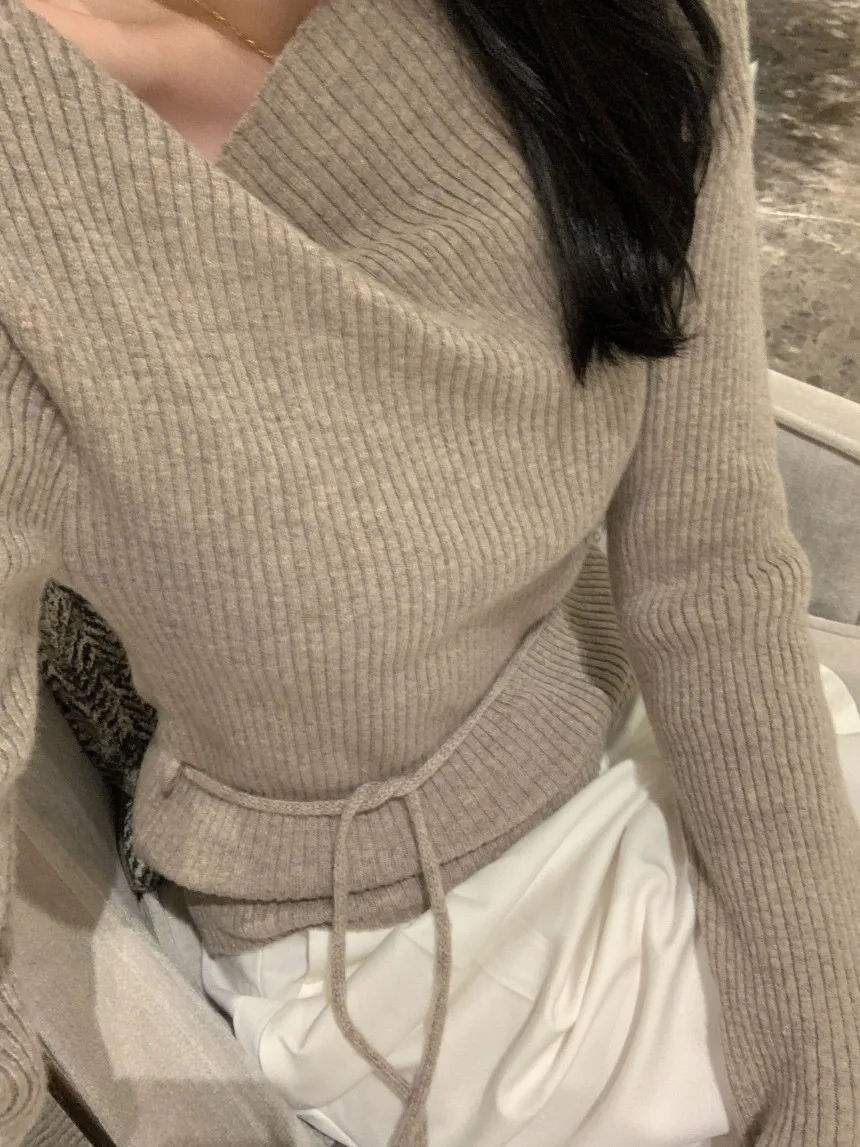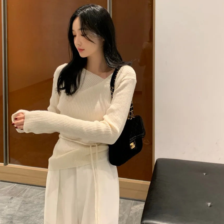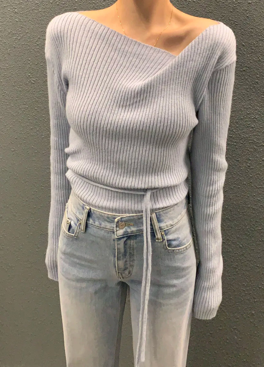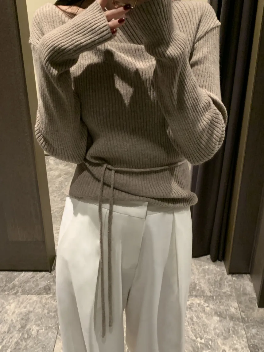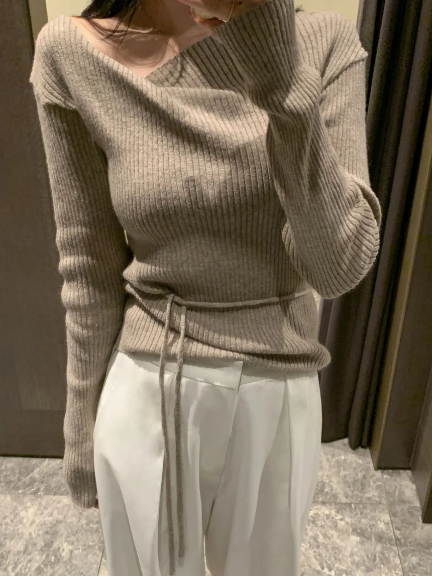 This Women's Slim Fit Knitted Top features a stylish V-neck design with a tie, adding a touch of elegance and sophistication.
