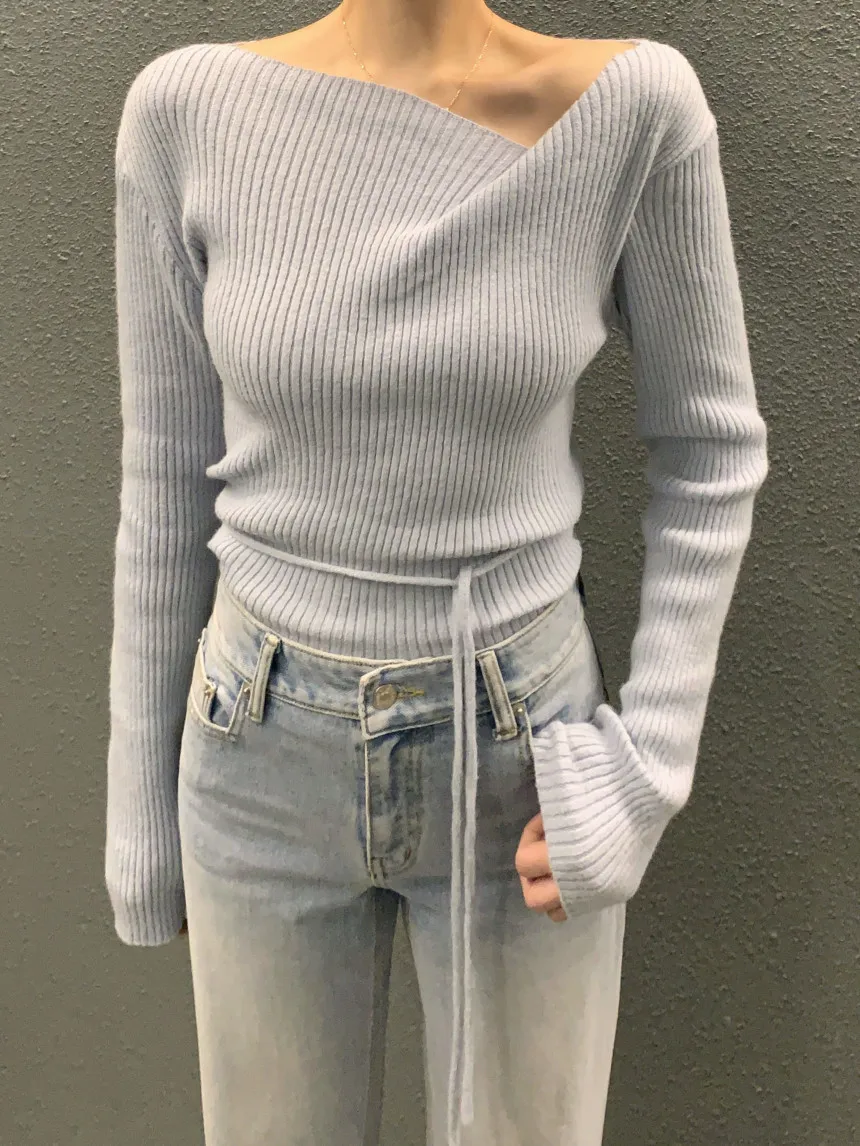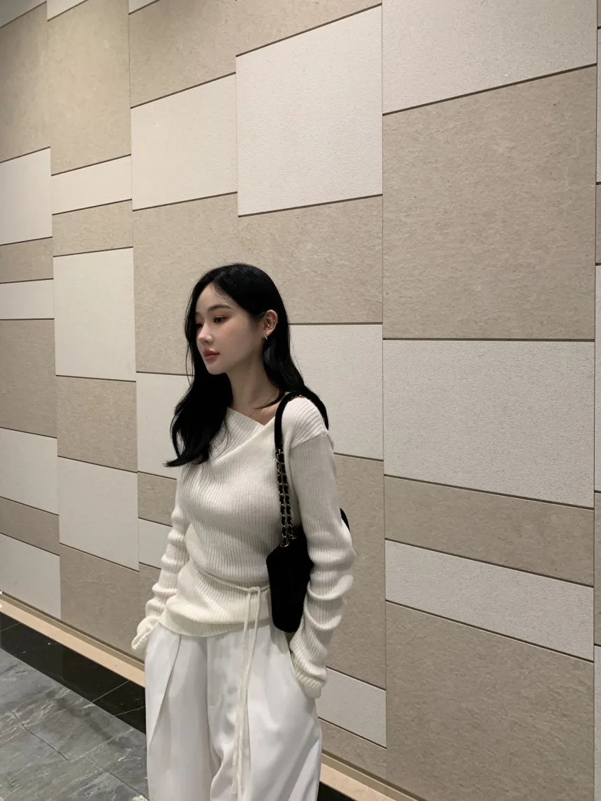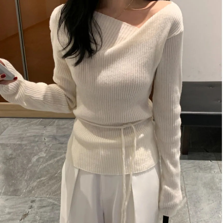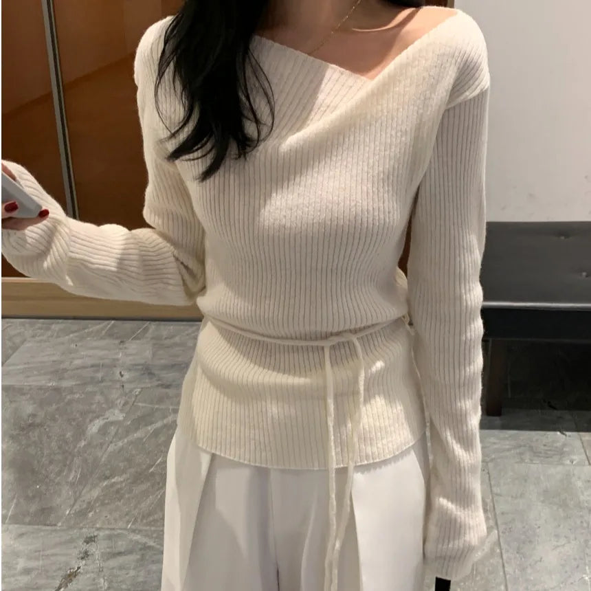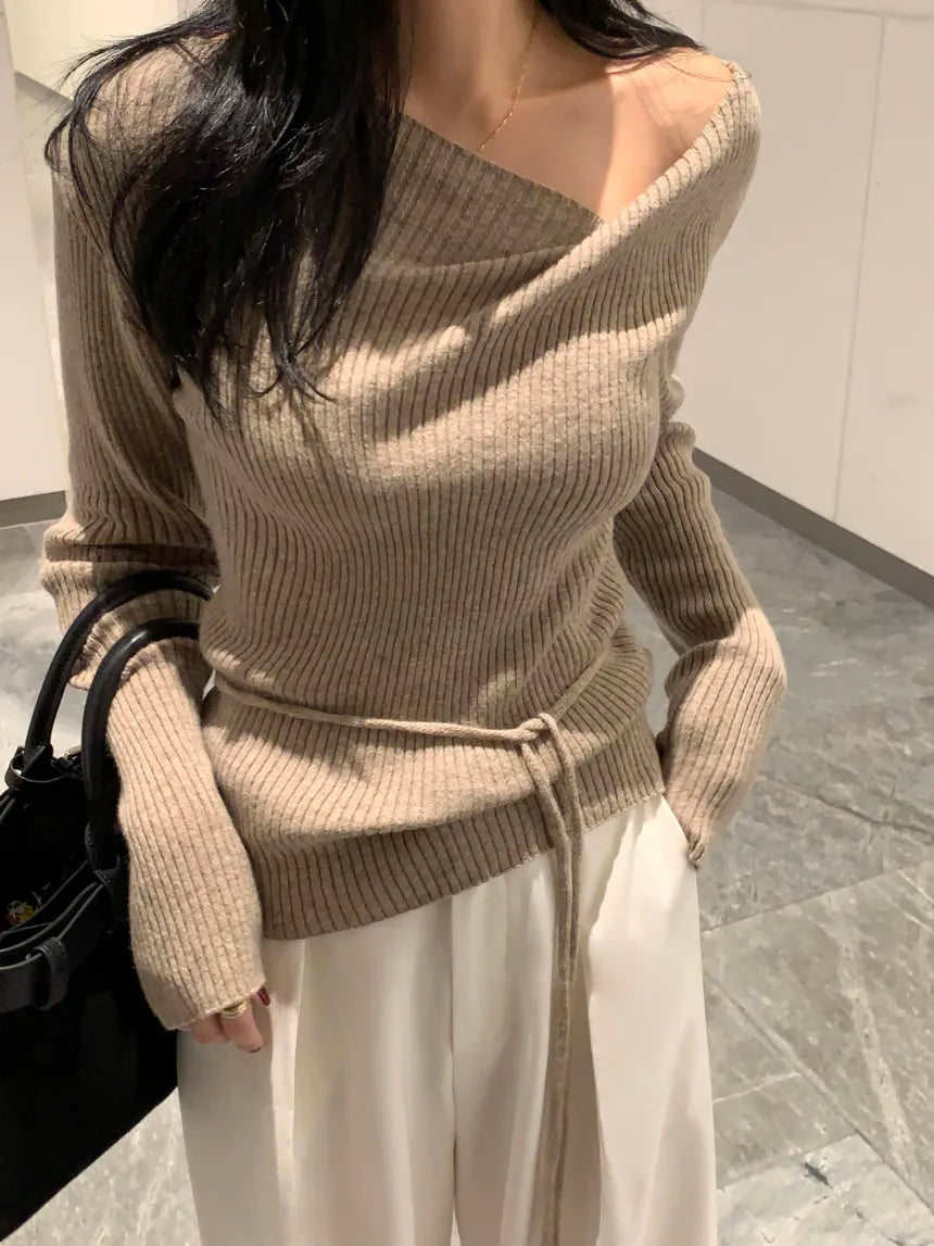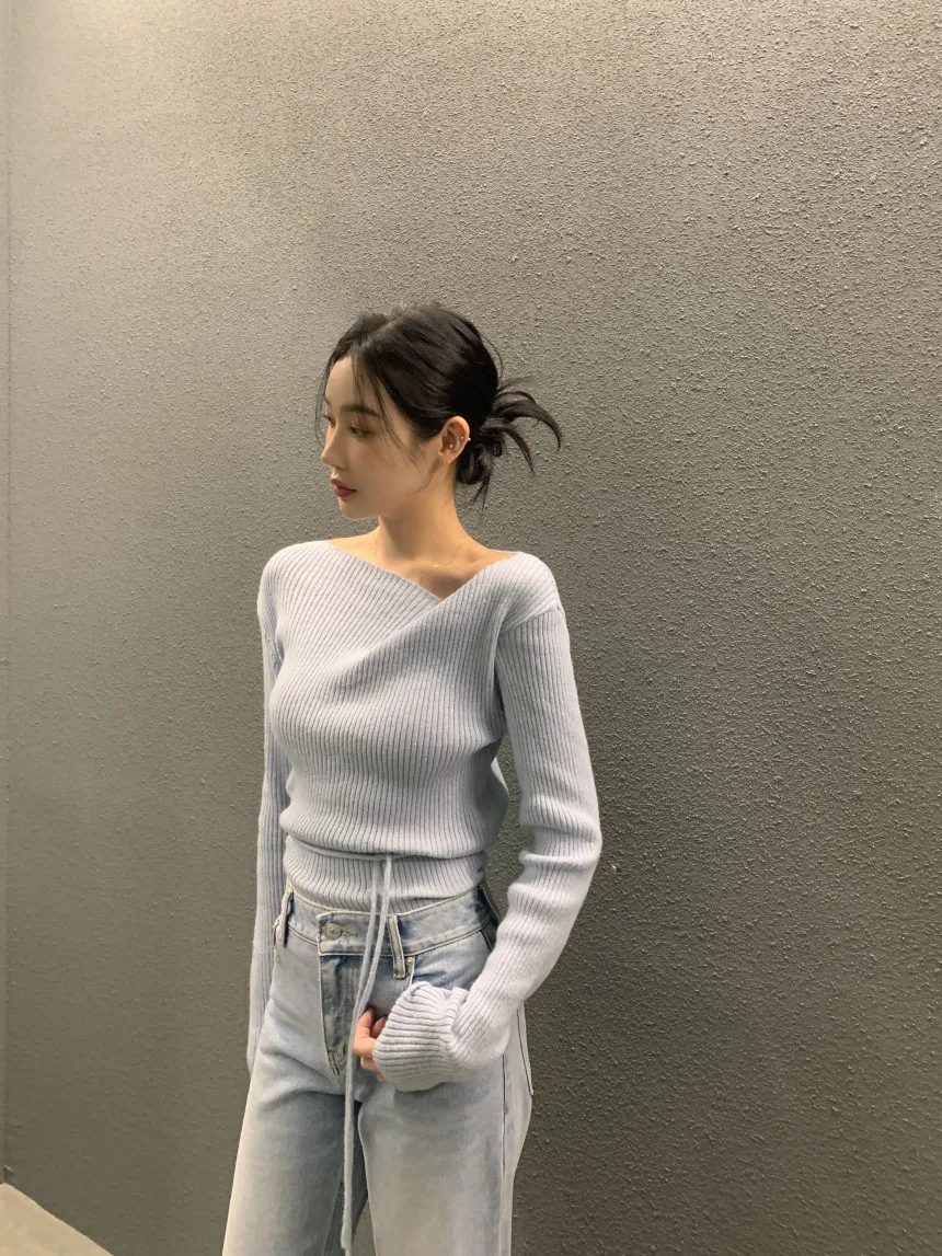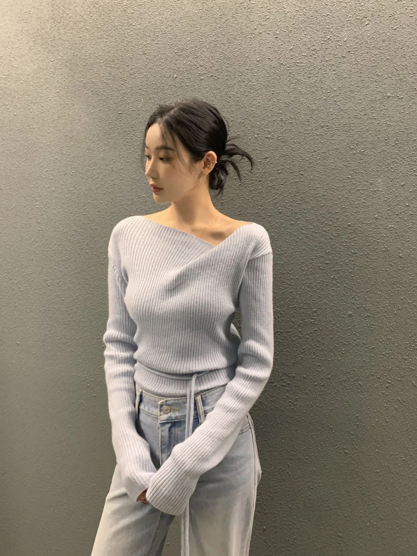 This Women's Slim Fit Knitted Top features a stylish V-neck design with a tie, adding a touch of elegance and sophistication.