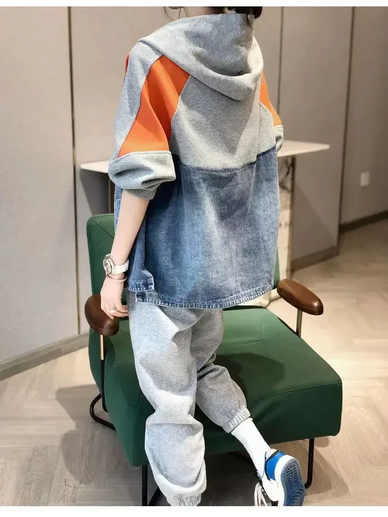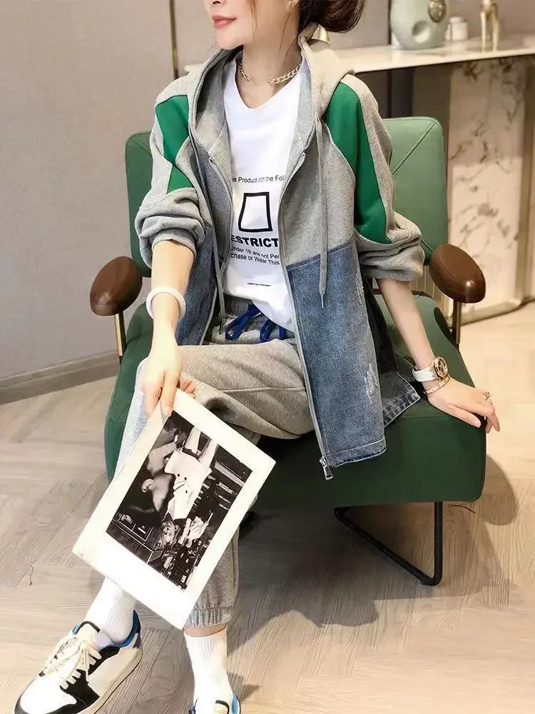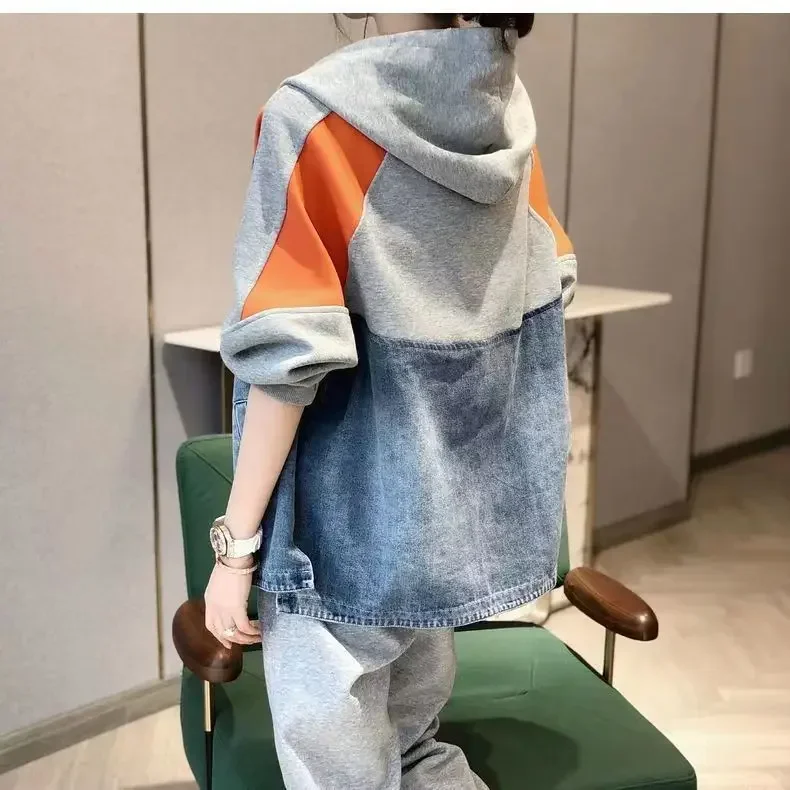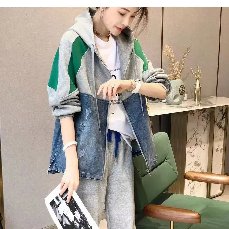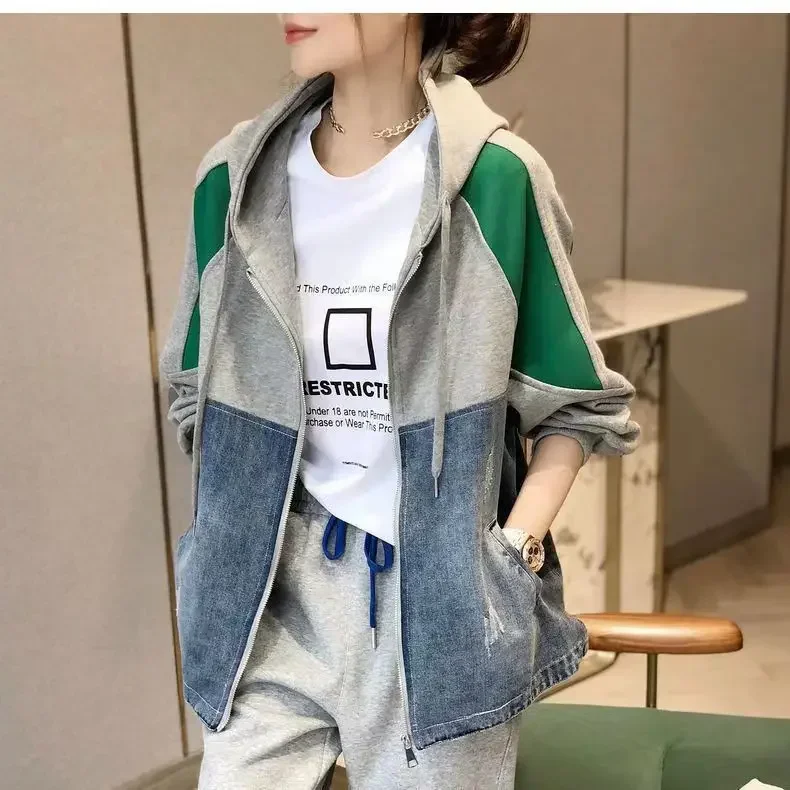 Spring and Autumn Patch Patchwork Jacket Fashion Denim Jacket Women's Korean Casual New Hooded Sweatshirt Denim Jacket