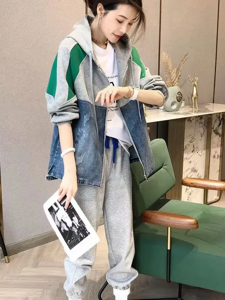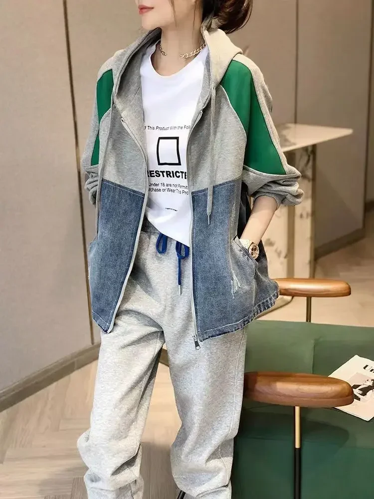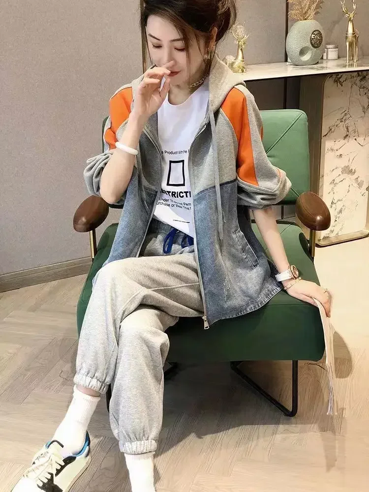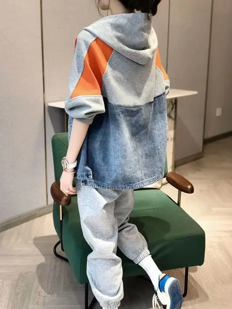 Spring and Autumn Patch Patchwork Jacket Fashion Denim Jacket Women's Korean Casual New Hooded Sweatshirt Denim Jacket