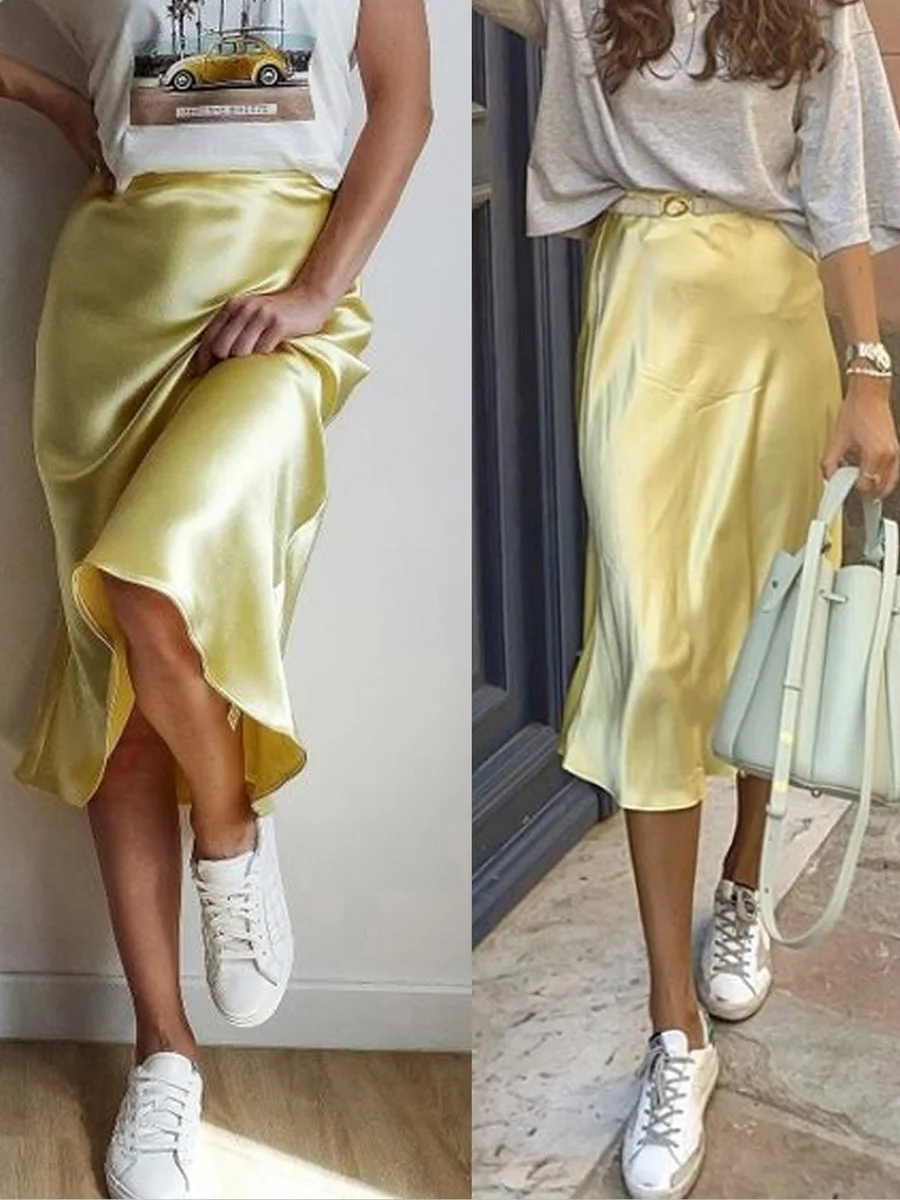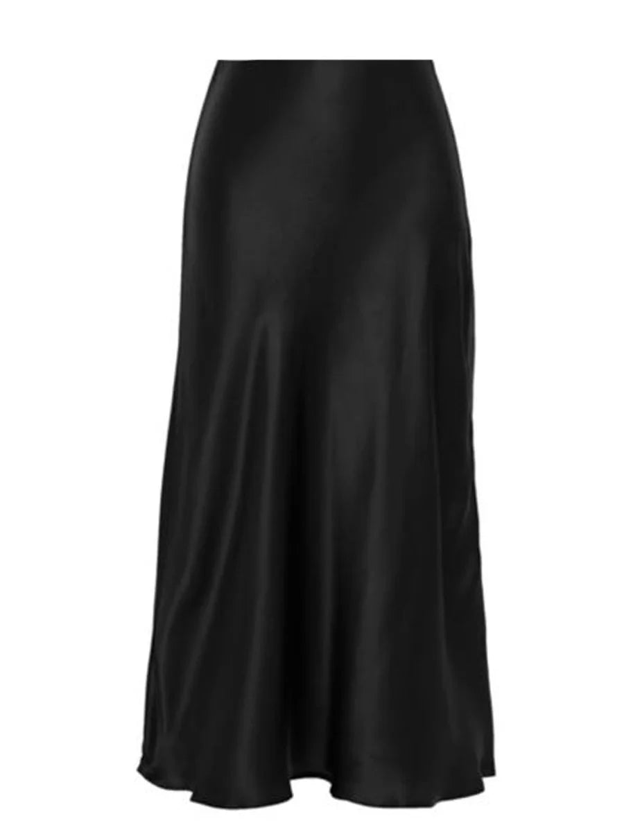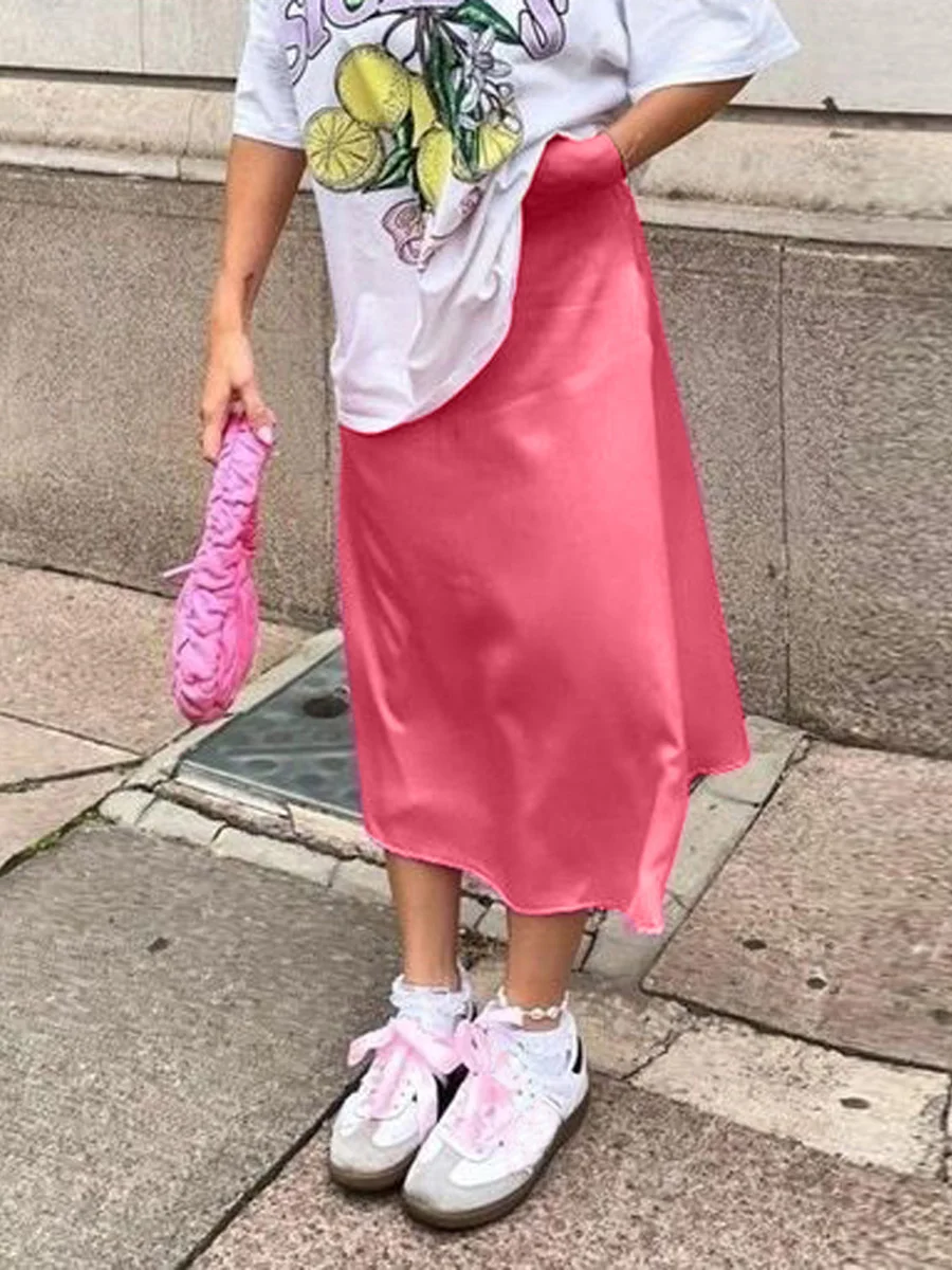 Women's Summer High Waist Skirt Solid Color Long Satin Skirt for Travel, Beach, Shopping