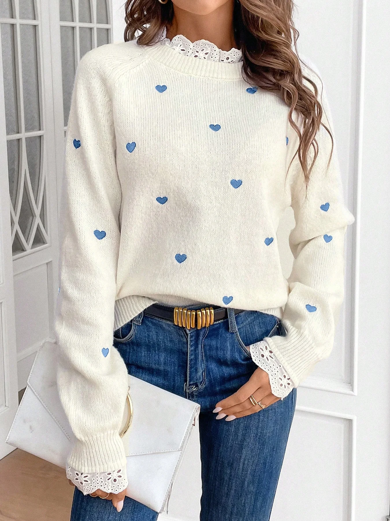 Featuring delicate lace accents and a heart-trimmed drop shoulder, this sweater exudes elegance and sophistication.
