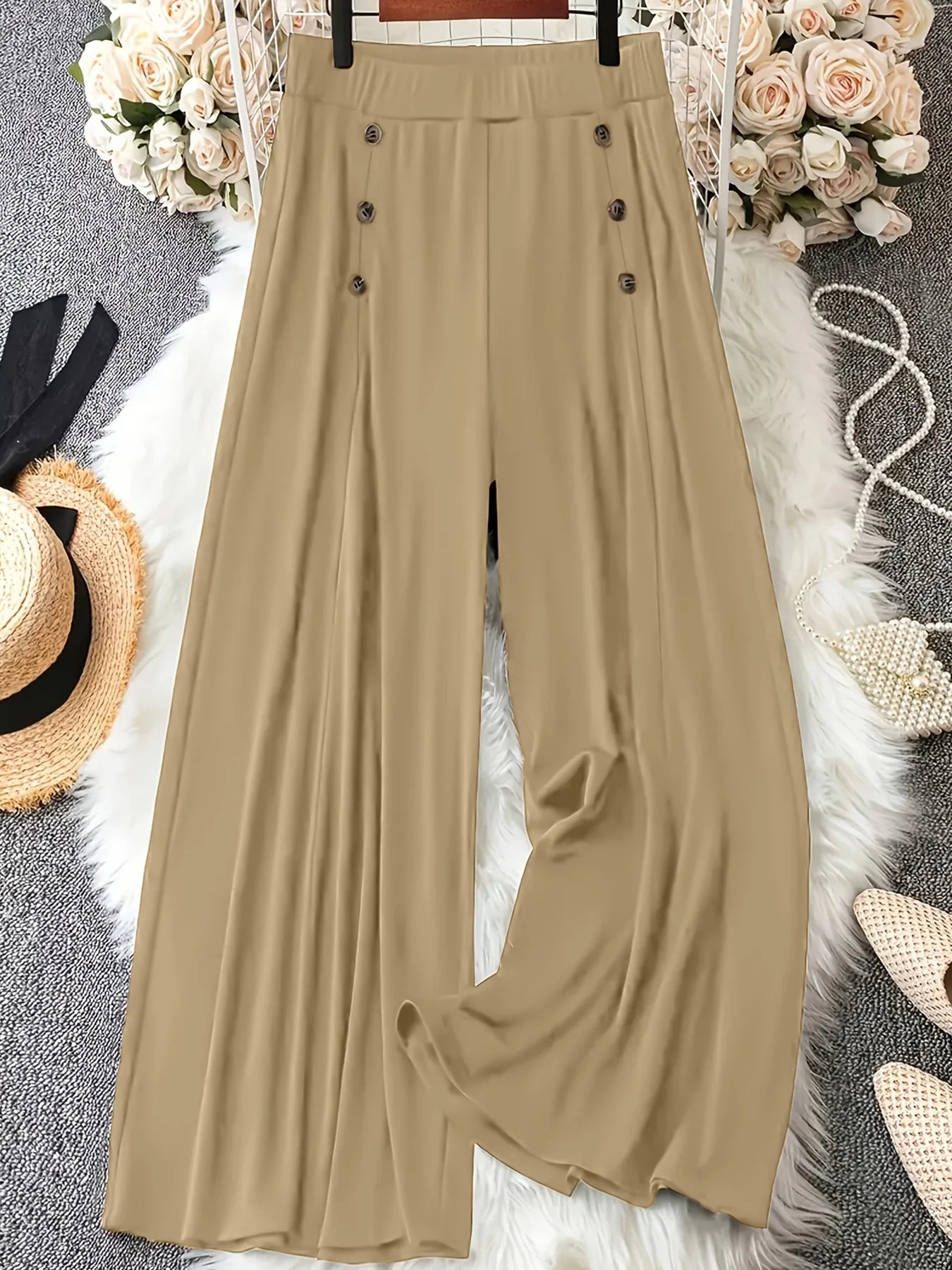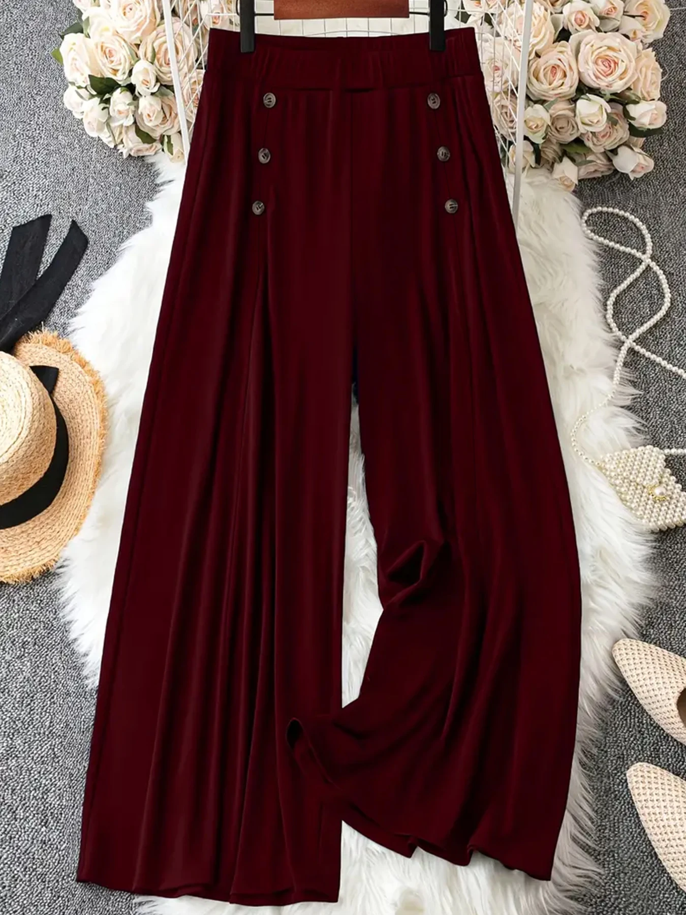 Simplicity meets sophistication with our solid color trousers featuring elegant decorative buttons for a touch of elegance.